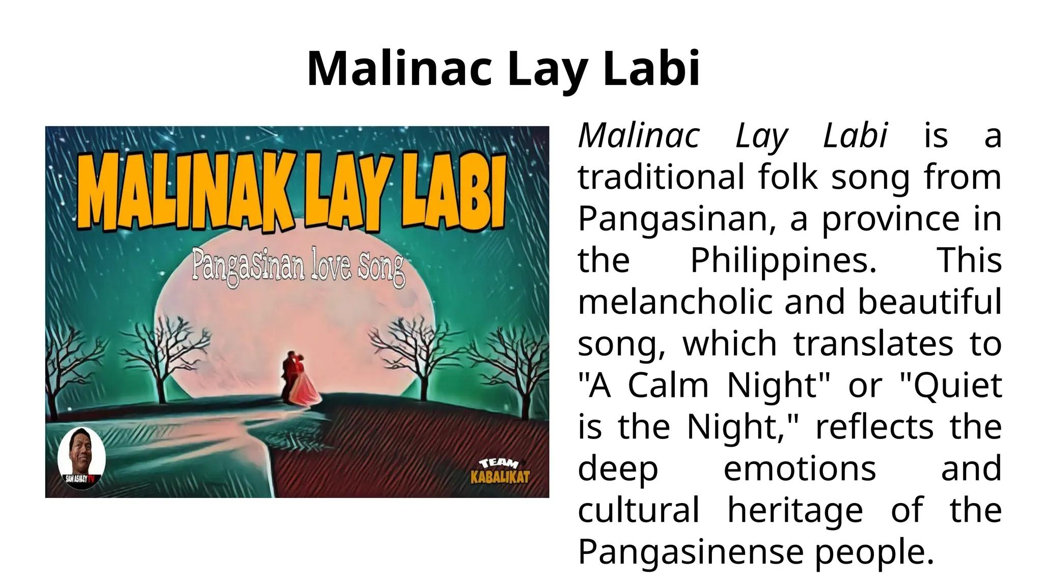 “Malinac Lay Labi” translates roughly to “A Bright Night.” The song embodies traditional Pangasinense lyrical style, blending poetic imagery of night and nature with the personal emotions of yearning for a beloved. Passed down orally through generations, it remains one of the best-known examples of Pangasinan’s pre-colonial musical heritage.